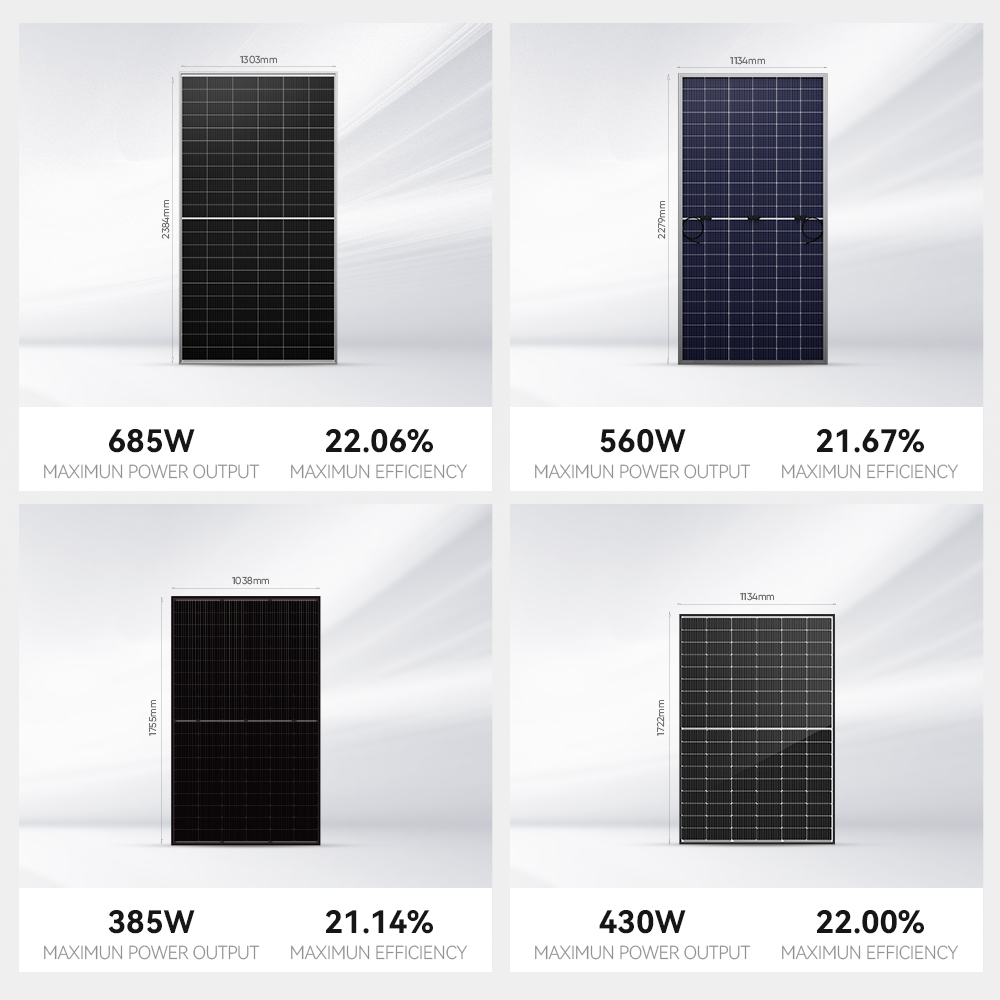 We currently have PERC, HJT, TOPCON, and shingle technology, power range between 5W-800W.