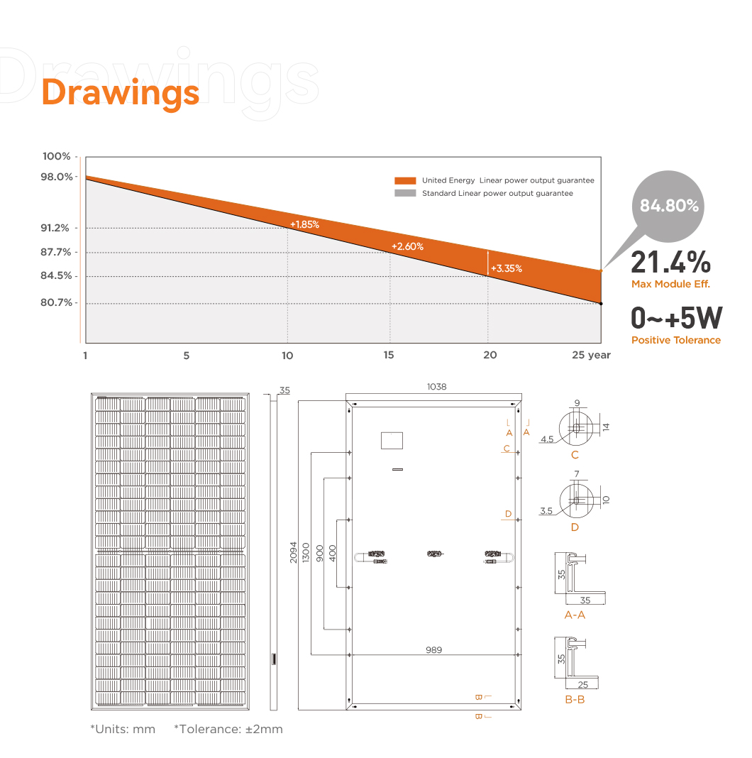 | Module Efficiency(%) | 20.25 | 20.4 | 20.71 | 20.94 | 21.17 | 21.4 | ||||