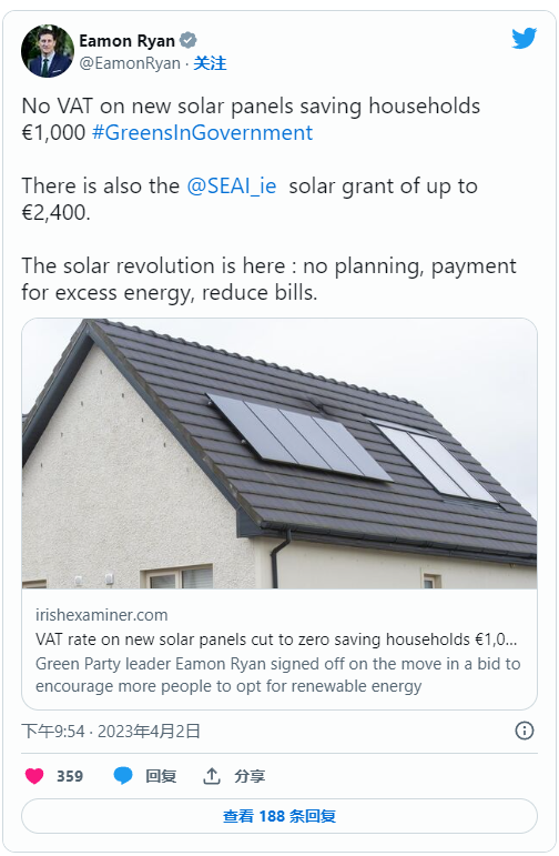 The Irish government plans to introduce a reduction in VAT for solar modules to 0%.The country's minister of environment, Eamon Ryan, made the announcement on its Twitter account.